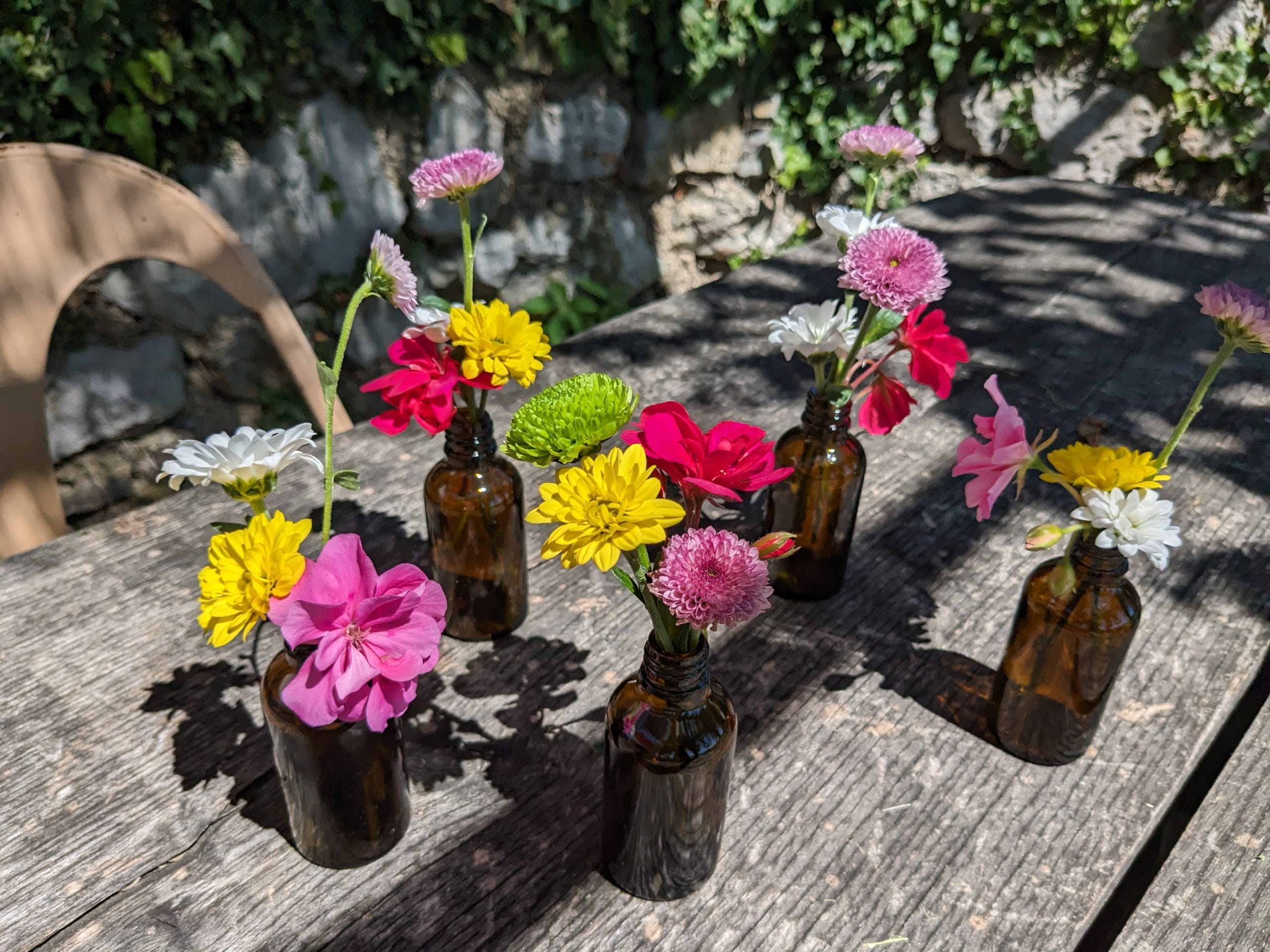 - Oblikovanje: V vsako stekleničko vstavite le nekaj cvetov. Bistvo je v minimalizmu – ena dominantna rožica in košček zelenja sta pogosto dovolj.