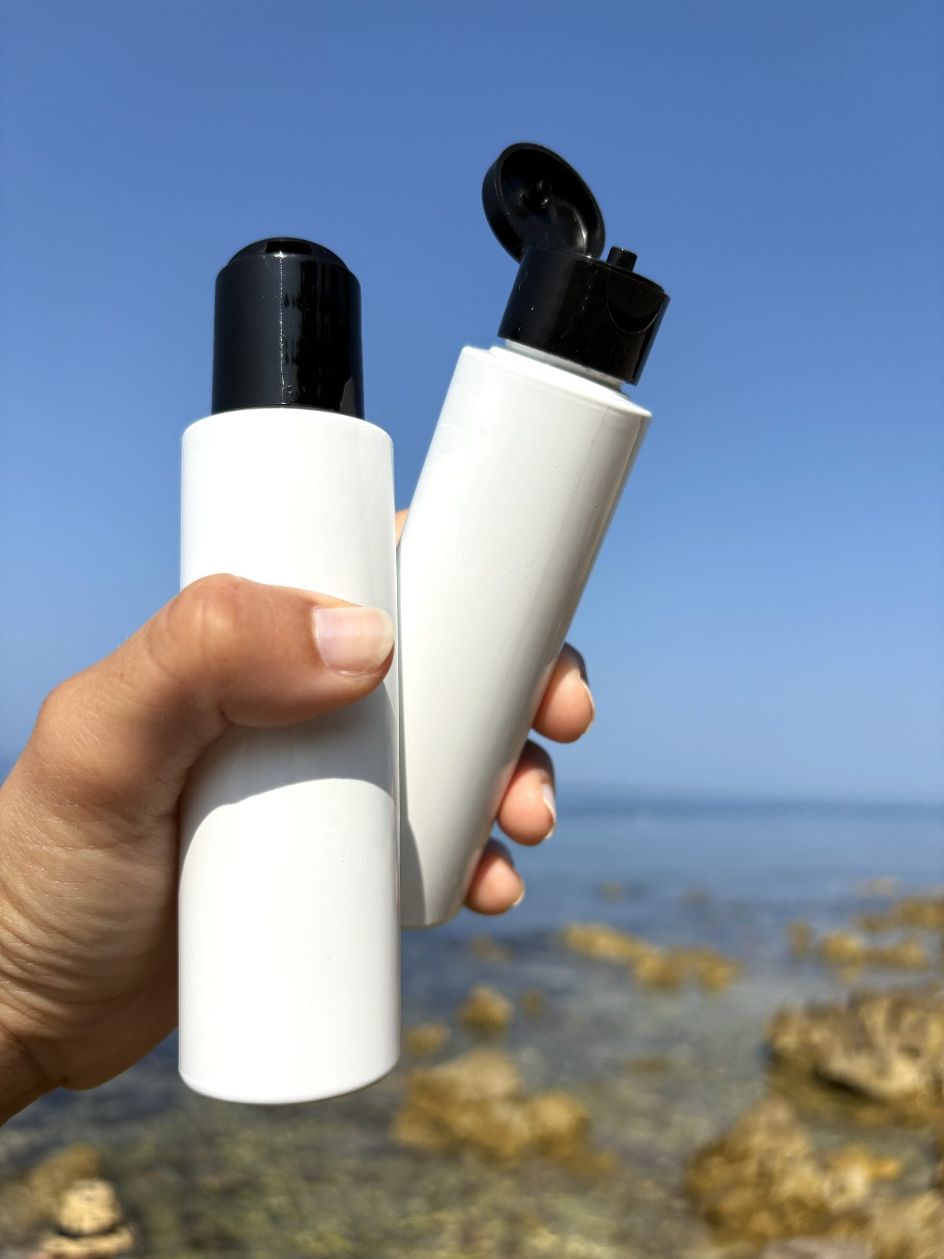 - Plastenke s pokrovčkom na navoj: Idealne za tekoče izdelke, kot so toniki ali micelarne vode. Izberite volumne med 30 ml in 100 ml – slednje je tudi zgornja meja za ročno prtljago na letalu.
